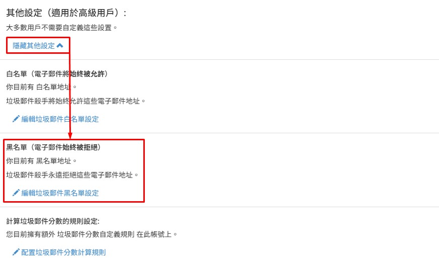 於【其他設定(適用於高級用戶)】點擊開啟「顯示其他設定」後,可﹝編輯垃圾郵件黑名單設定﹞。